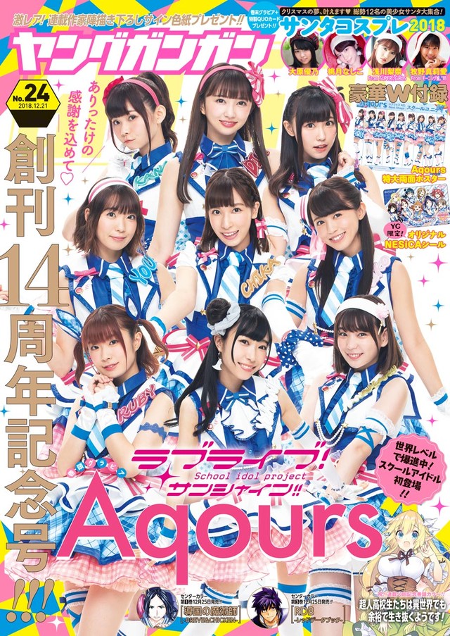 ヤングガンガン(スクウェア・エニックス)が、本日12月7日発売の24号で創刊14周年を迎えた。表紙と巻頭グラビアには、さまざまなメディアで活躍するスクールアイドルグループ・Aqoursが登場している。