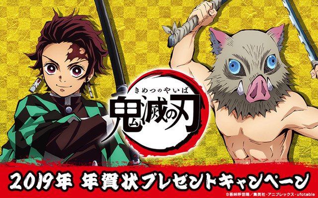 吾峠呼世晴原作のTVアニメ「鬼滅の刃」が2019年4月より放送されることを記念し、アニメの描き下ろしイラストを使用した年賀状が、抽選で2019名に当たるキャンペーンが開催されている。