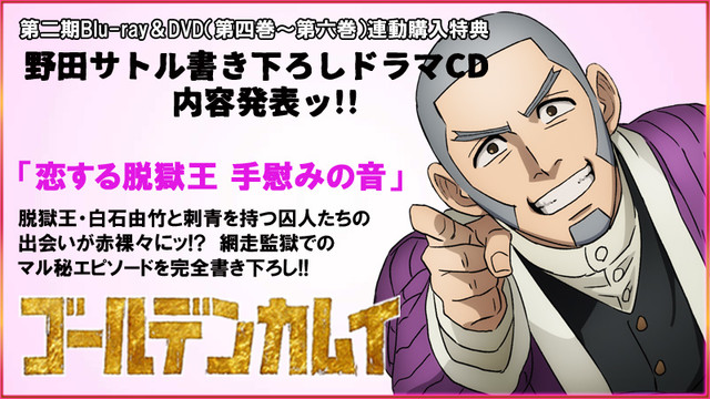 エピソードのタイトルは「恋する脱獄王 手慰みの音」。脱獄王・白石由竹と刺青を持つ囚人たちの出会いが描かれ、脱獄は1人で行うのを鉄則としている白石がなぜ彼らの仲間に加わったのか、真相が明かされる。「原作者・野田サトル書き下ろしドラマCD」は、対象法人・店舗にてTVアニメ「ゴールデンカムイ」Blu-ray / DVD第4巻~第6巻を予約及び購入した人を対象にプレゼント。詳細は公式サイトにてチェックしよう。