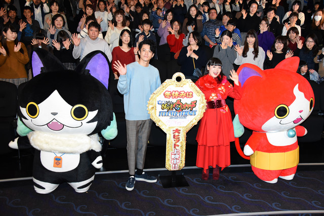イベントの冒頭では、子供たちに「ジバニャーン!!」と大きな声で呼ばれたジバニャンが、それに負けじと元気いっぱいに登場。「思ったより急ニャン……!!」とスロープに苦戦する姿を見せながらも懸命にステージへと上がり、映画を鑑賞したばかりの観客の反応を確認して「みんな(映画を)喜んでくれたニャンね!」とうれしそうに飛び跳ねた。日野、小栗、ブルゾンちえみに続き登壇した同作の主人公・猫又は、「全国のお客さんが俺っちの大活躍を見て、ファンクラブができちゃうかもしれないニャンね! ニャッハッハッハ!」と声高らかに笑った。