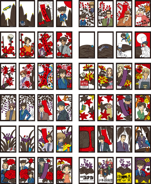 花札にはコナンや安室透、怪盗キッドといった主要キャラクターから“犯人”まで、「名探偵コナン」に登場する28キャラクターが48枚の札に盛り込まれた。通常の花札として遊べるほか、付属の説明書にはオリジナルの役も掲載。また花札の絵柄を使用した全12種のトレーディングラバーストラップと、全25種のトレーディングクリアファイルも併せて発売される。