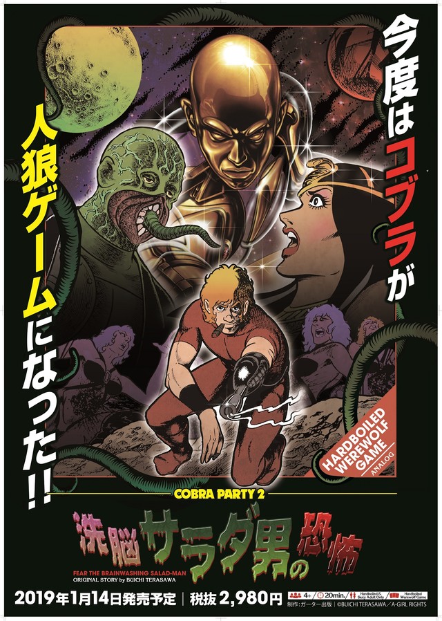寺沢武一「コブラ」を題材にした人狼ゲーム「コブラ・パーティ2洗脳サラダ男の恐怖」が、2019年1月14日に発売される。