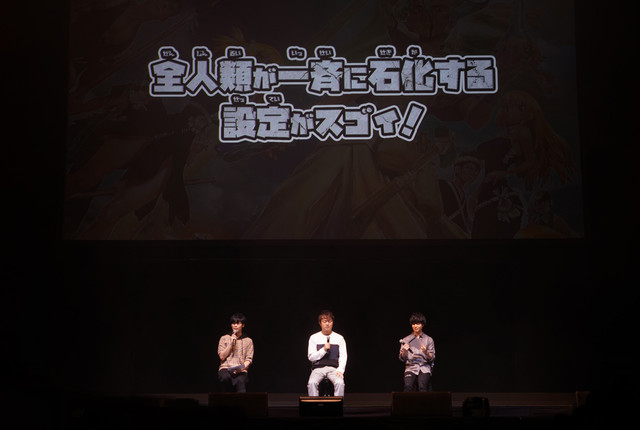 3人が揃った壇上ではまず、「唆るぜ、これは! 『Dr.STONE』のココがスゴイ! 3大ポイント!!」と銘打った作品の紹介コーナーを実施。本作のポイントとして「全人類が一斉に石化する設定がスゴイ!」「科学でなんでも作っちゃうところがスゴイ!」「絵がとにかくスゴイ!」の3つが挙げられる。全人類が一斉に石化してしまうという設定について、稲垣は「めちゃくちゃ」と笑いながらも、同設定から本作の構想がスタートしたことを明かす。さらに稲垣は本作で描きたかったのは「地道にがんばる男」であると説明し、派手ではなくとも地道にがんばる人間のカッコよさを語った。