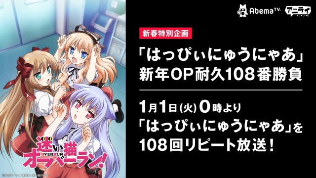 アニメ「迷い猫オーバーラン!」のオープニング楽曲「はっぴぃにゅうにゃあ」を108回リピートして流す「『はっぴぃにゅうにゃあ』新年OP耐久108番勝負」が、2019年1月1日0時よりAbemaTVのアニメLIVEチャンネルにて行われる。