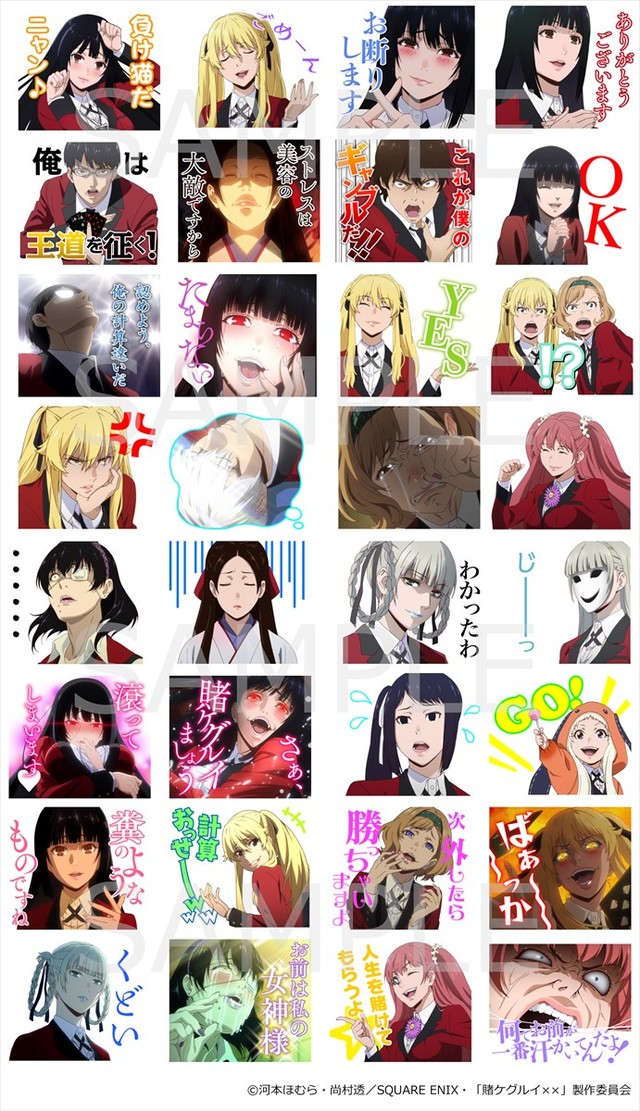 TVアニメ「賭ケグルイ××」の放送が、1月よりスタートすることを記念したこのスタンプ。絵柄には「ありがとうございます」「わかったわ」といった日常使いしやすいものから、「滾ってしまいます」「負け猫だニャン♪」といったお馴染みの作中セリフまで、全32種が用意された。購入には120円、または50コインが必要。