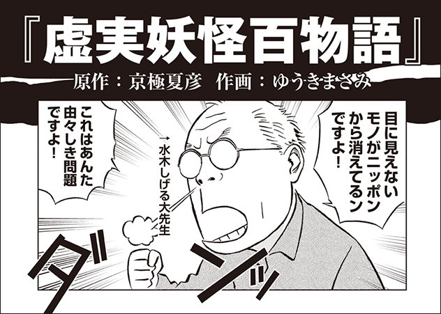 ゆうきまさみが京極夏彦「虚実妖怪百物語」をマンガ化、水木しげるも登場 2018年12月31日2018年12月31日 editor ゆうきまさみが描いた「虚実妖怪百物語」とのコラボマンガより。ゆうきまさみが、京極夏彦の小説「虚実妖怪百物語」の冒頭部分をコミカライズした。 これは角川文庫の創刊70周年を記念して行われている、人気作家の最新文庫作品の冒頭を人気マンガ家がコミカライズするコラボ企画の第4弾。「虚実妖怪百物語」は原稿用紙にして1900枚にもおよぶ京極小説史上最長の作品で、水木しげるや荒俣宏、綾辻行人といった人物が実名で登場するのも特徴だ。ゆうきがマンガ化した作品の冒頭部分にも、水木の姿が描かれている。 関連記事「名探偵コナン」アニメ30周年企画始動、制作過程明かす企画展が東京を皮切りに全国で「Yahoo!検索大賞2025」アニメ部門1位は「GQuuuuuuX」、声優部門は戸田恵子劇場版「名探偵コナン」29作目のタイトルは「ハイウェイの堕天使」、ビジュアル公開生身の人間を描く「違国日記」沢城みゆきは諏訪部順一の演技に「今までで一番好きかも」「暗殺教室」殺せんせーがダイヤやルビー輝く“宝石フィギュア”に、100体限定発売アニメ「千歳くんはラムネ瓶のなか」福井の小路を歩く優空のビジュアル Tweet