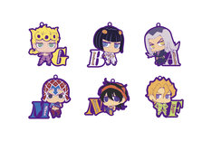 ラバーマスコットはその商品名の通りジョルノ、ブチャラティ、アバッキオ、ミスタ、ナランチャ、フーゴの6種類をラインナップ。デフォルメイラストとそれぞれのイニシャルを組み合わせたデザインが採用されており、ボールチェーンも付属する。価格は1個につき税込み702円。