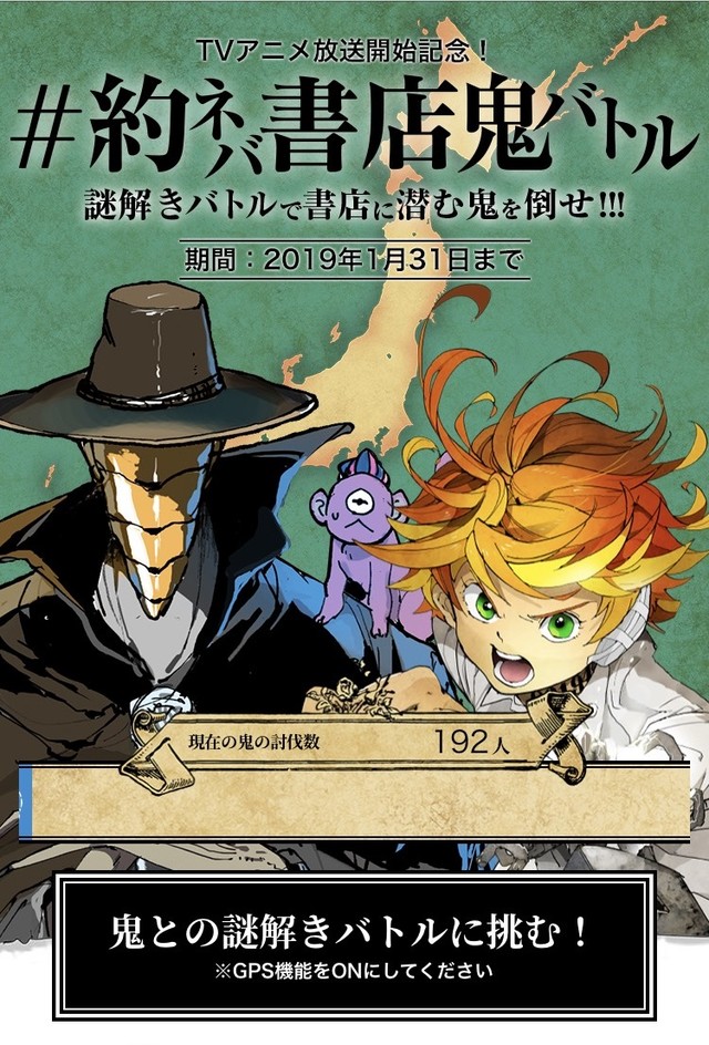 本キャンペーンは「約束のネバーランド」最新12巻の発売とアニメの放送開始を記念し、全国約2500店の書店と連動して行われるもの。スマートフォンから「#約ネバ書店鬼バトル」の特設サイトにアクセスすると、スマートフォンの位置情報機能を使用して近隣の“鬼が潜んでいる”書店を調べることができる。鬼が潜む書店の半径300m以内に入ると、鬼との謎解きバトルが開始。バトルに勝利すると、主人公・エマたちからのメッセージが収められた、スペシャル動画を閲覧できる。モールス信号を使った隠しコマンドも用意された。