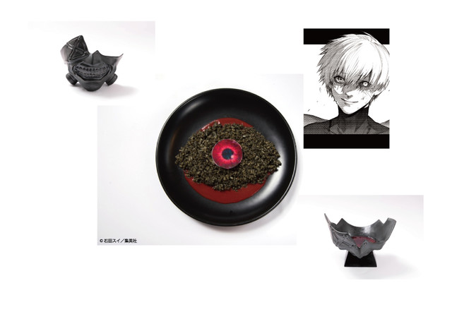 このたび展開されるコラボカフェでは、2017年に開催された「東京喰種CAFE」でも話題を呼んだ「まずいサンドイッチ」「本当にこれを食べるのか…?バーガー」などのメニューが復刻。同じく復刻となる「カネキの隻眼カレー」を注文すると、カネキのマスクをイメージした器でノンアルコールスパークリングを楽しむことができる。そのほか目玉をイメージしたチーズ、耳たぶをイメージしたパスタと合わせて提供される「『美食家』月山のローストビーフ」、ケーキをナイフで切るとベリーソースが溢れ出る「キジマの断末魔レアチーズケーキ」、オリジナルチャーム付きの「トーカのゼリードリンク」などが用意された。