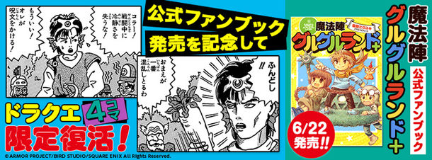 「ドラゴンクエスト4コママンガ劇場」の掲載は、6月22日に「魔法陣グルグル」のファンブック「魔法陣グルグルランド+」が発売されることを記念し展開されるもの。ガンガンONLINEでは6月12日から7月10日までの期間中、毎週月・木曜に更新され、マンガUP!では7月11日から29日までの期間、毎日1ページずつ配信される。なお6月22日には「魔法陣グルグル2」8巻も同時リリース。