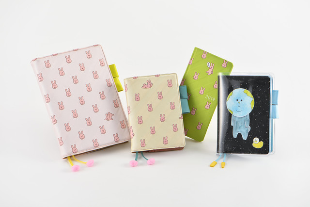 スキウサギの手帳は「オリジナル」「カズン」「weeks」の3種類をラインナップ。“ウザかわいい”スキウサギの姿がネクタイ生地の織りで表現されている。またちきゅうちゃん。は糸井重里が文章、キューライスがイラストを担当した絵本のキャラクター。ホワイトとゴールドの星々がプリントされた「柄入りカバー・オン・カバー」を手帳にかけると、ちきゅうちゃん。が宇宙に佇む姿が楽しめる。そのほかほぼ日手帳の公式サイトではキューライスのインタビューを公開中だ。