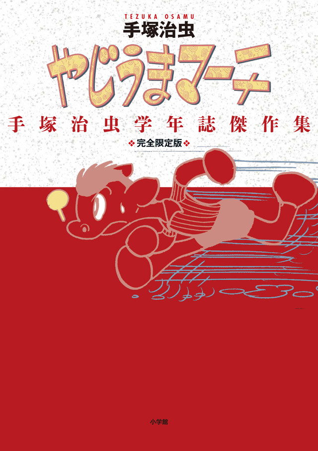 小学館の学年誌・小学二年生で1970年9月号から1971年2月号まで連載された「やじうまマーチ」は、「やじのうまたろう」という名の、馬とも人間ともつかない少年が巻き起こす騒動を描いたドタバタギャグ。同作が単行本化されるのは今回が初めてとなる。このたびの「完全限定版」では手塚プロに保管されていた原稿を用い、最新のDTP技術で製版され、初出時よりも美麗な状態で刊行された。