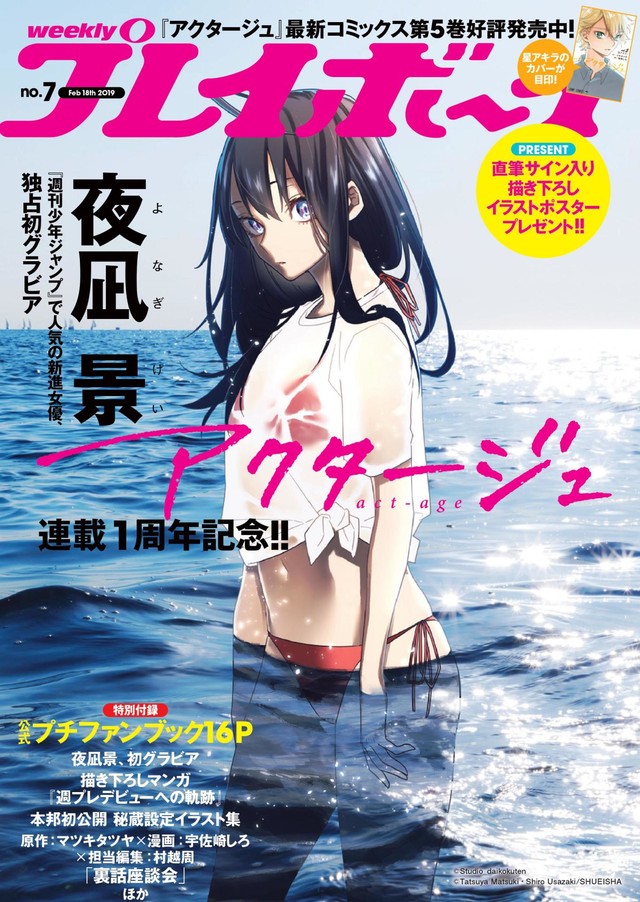さらに同じく本日発売の週刊プレイボーイ7号(集英社)の裏表紙に「アクタージュ act-age」の主人公・夜凪景が水着姿で登場。描き下ろしマンガや同作の人物相関図、マツキ、宇佐崎と担当編集の村越周氏による座談会などを収めた「アクタージュ act-age」のプチファンブックも付属している。なお週刊プレイボーイ7号の裏表紙に使用されたイラストのポスターが抽選で5名にプレゼントされる。希望者は同号の応募券をはがきに貼り、必要事項を明記して2月18日までに申し込もう。