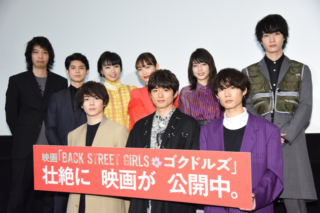 ジャスミン・ギュ原作による実写映画「BACK STREET GIRLS -ゴクドルズ-」の公開記念舞台挨拶が、本日2月9日に東京・新宿バルト9にて開催。山本健太郎役の白洲迅、立花リョウ役の花沢将人、杉原和彦役の柾木玲弥、アイリ役の岡本夏美、マリ役の松田るか、チカ役の坂ノ上茜、木村役の菅谷哲也、小泉成二役の桜田通、監督を務めた原桂之介が登壇した。