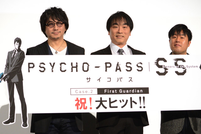 「PSYCHO-PASS サイコパス Sinners of the System」は、宜野座伸元と霜月美佳を軸にした「Case.1 罪と罰」、須郷徹平と征陸智己を軸とした「Case.2 First Guardian」、狡噛慎也を軸とした「Case.3 恩讐の彼方に__」の劇場3作品。本日行われた舞台挨拶には、須郷徹平役の東地宏樹、狡噛慎也役の関智一、塩谷直義監督が登壇した。