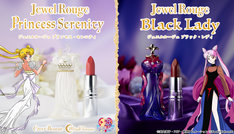 「美少女戦士セーラームーン」シリーズの作中に登場する、1000年前の月の王国シルバー・ミレニアムの王女プリンセス・セレニティと、ちびうさが悪の心に染まってしまった姿ブラック・レディのドレスをモチーフにしたこのアイテム。「ミラクルロマンス ジュエルルージュ プリンセス・セレニティ」は、明るく上品なピンク色のルージュ。ケースには、胸元に連なる丸い飾りが特徴的な純白のエンパイアドレスがデザインされた。「ミラクルロマンス ジュエルルージュ ブラック・レディ」は、妖艶な雰囲気を纏ったボルドー色。深いスリットが入ったドレス、羽衣のようなストールなどが容器に表現されている。