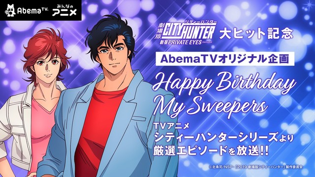 北条司原作によるアニメ映画「劇場版シティーハンター 」のヒットを記念し、冴羽リョウと槇村香の生誕を祝した特別番組「Happy Birthday My Sweepers ~リョウと香の生誕に“愛ともっこり”を込めて~(前編・後編)」が、AbemaTVのみんなのアニメチャンネル2にて3月下旬に放送される。