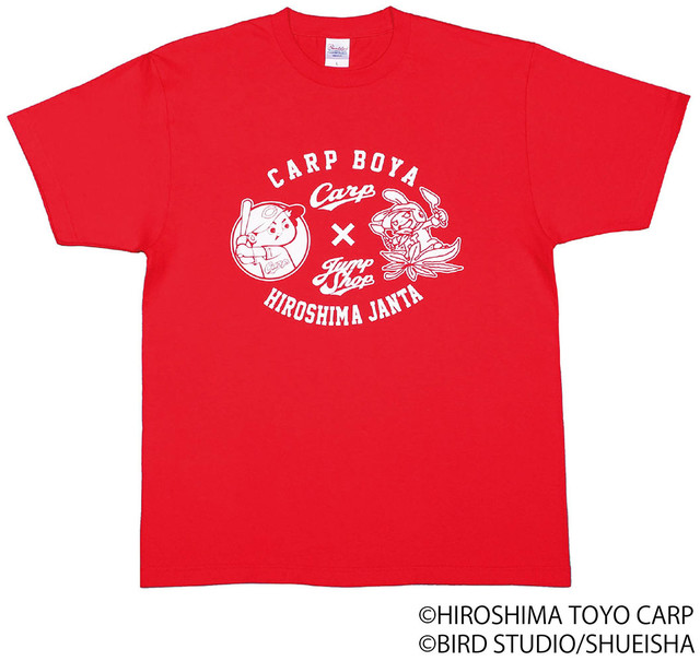 鳥山明が描き下ろしたJUMP SHOPオリジナルキャラクター・ジャンタと広島東洋カープのマスコットキャラクター・カープ坊やのコラボTシャツとトートバッグが、3月15日にJUMP SHOP広島店で発売される。
