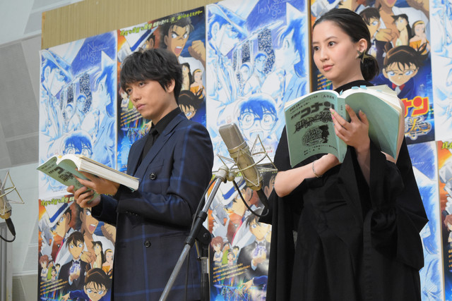 青山剛昌原作による劇場アニメ「名探偵コナン 紺青の拳(こんじょうのフィスト)」の公開アフレコイベントが、本日3月14日に東京都内のスタジオで開催。ゲスト声優の山崎育三郎と河北麻友子が登壇した。
