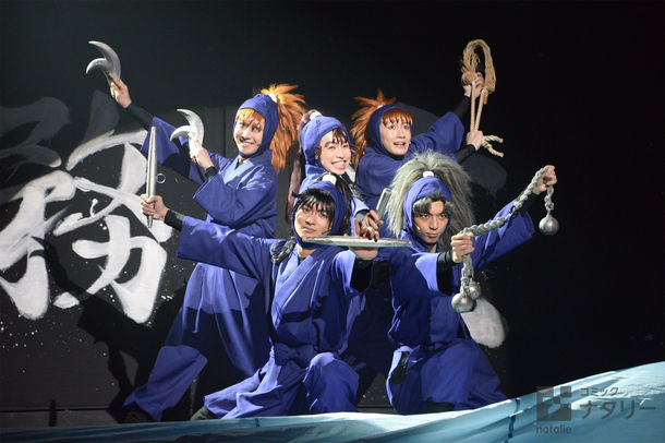 「ミュージカル『忍たま乱太郎』第8弾 再演 ~がんばれ五年生!技あり、術あり、初忍務!!~」ゲネプロより。上段左から久下恭平演じる鉢屋三郎、佐藤智広演じる尾浜勘右衛門、吉田翔吾演じる不破雷蔵。下段左から山木透演じる久々知兵助、栗原大河演じる竹谷八左ヱ門。 (c)尼子騒兵衛 / NHK・NEP (c)ミュージカル「忍たま乱太郎」製作委員会