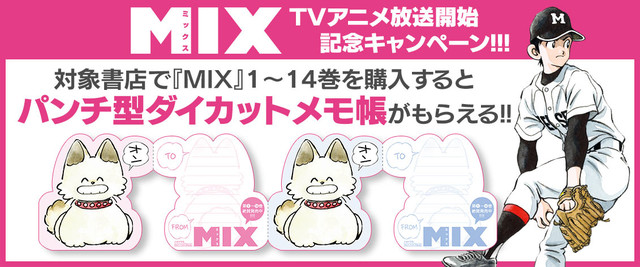 このたびのフェアでは、対象書店で「MIX」1~14巻を購入した人に、1冊につき1点、「パンチ型ダイカットメモ帳」をプレゼント。キャンペーンの対象書店はゲッサン(小学館)公式サイトにて公開されている。