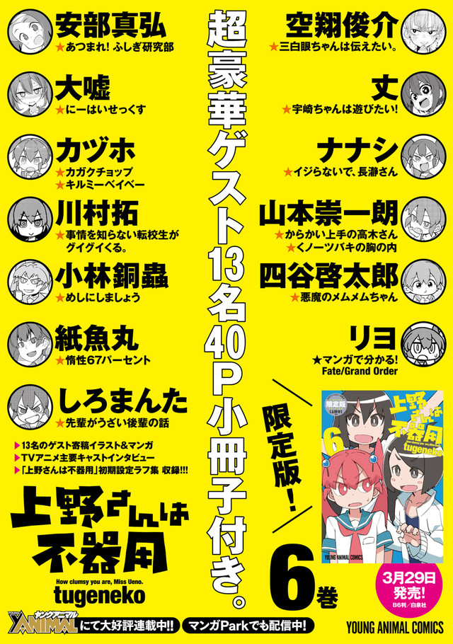 tugeneko「上野さんは不器用」の6巻が、本日3月29日に発売された。通常版に加え、公式アンソロジー小冊子「上野本」付きの限定版も用意されている。