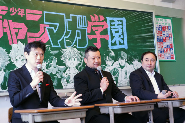 発表会ではまず集英社より少年ジャンプ+担当の細野修平氏、講談社よりマガジンポケット担当の橋本脩氏が登壇し、若い世代にマンガを読む機会を増やしてほしいという思いから誕生した少年ジャンマガ学園について説明。その後週刊少年ジャンプの中野裕之編集長、週刊少年マガジンの栗田宏俊編集長とケンドーコバヤシが登場しトークセッションが行われた。