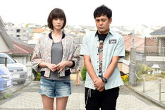 羽田梓役の本田翼(左)と、富岡ゆうじ役の有田哲平(右)。(c)TBS