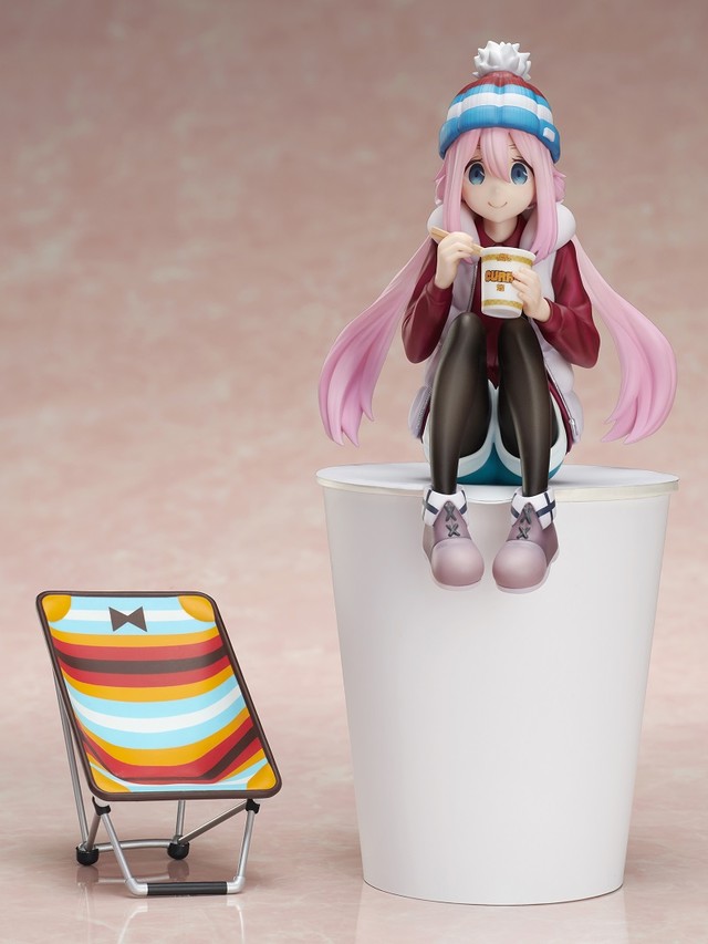 カップ麺のフタを押さえるオリジナルフィギュアシリーズ「ぬーどるストッパーフィギュア」の新作となる本アイテム。なでしこがカレーめんを食べる作中のシーンを、TVアニメ最終話の衣装で表現し、ダウンベストやニット帽の素材感やカレーめんの具材まで丁寧に造形されている。さらにキャンプ用のローチェアを模した台座も付属。フィギュアとしても、カップ麺の蓋のストッパーとしても楽しめる。