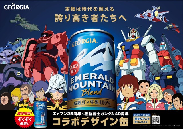 このコラボレーションは「ジョージア エメラルドマウンテンブレンド」の発売25周年を記念したもの。4月22日から8月末まで、1年戦争の流れに沿った4ステージに分かれて全25種類のデザイン缶が登場する。ガンダムの出撃から大気圏突入までを扱うステージ1では、「ガンダム(アムロ)」や「シャア専用ザク(シャア)」など6種類が用意された。