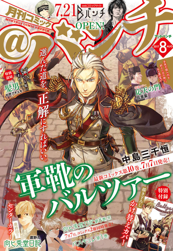 本日6月21日に発売された月刊コミック@バンチ8月号(新潮社)には、中島三千恒「軍靴のバルツァー」が表紙で登場。併せて中島の描き下ろしイラストを用いた、単行本かけかえカバーが付録として綴じ込まれている。