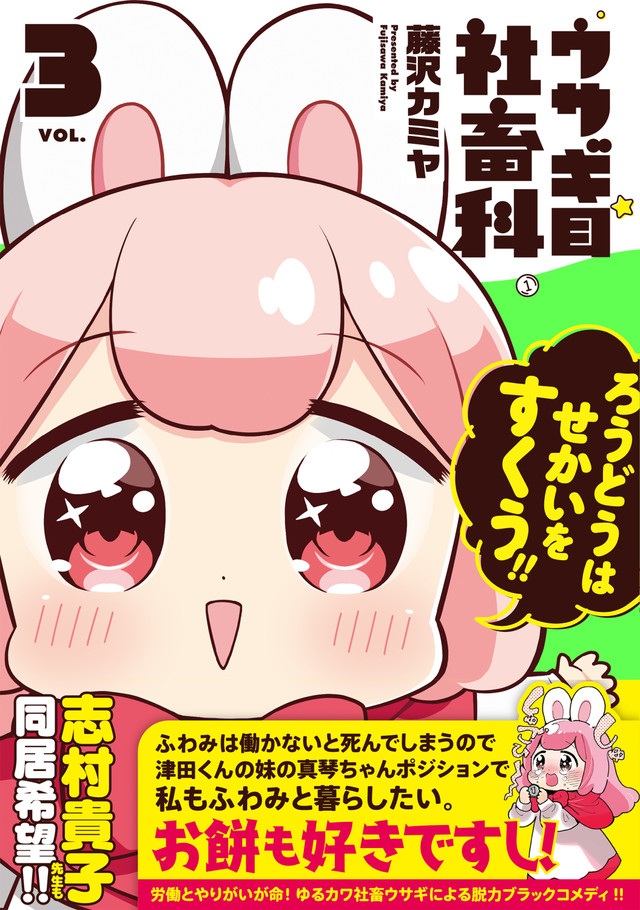 藤沢カミヤ「ウサギ目社畜科」の単行本3巻が、本日4月19日に発売された。帯には志村貴子が「ふわみは働かないと死んでしまうので津田くんの妹の真琴ちゃんのポジションで私もふわみと暮らしたい。お餅も好きですし!」とのコメントとともにイラストを寄せている。