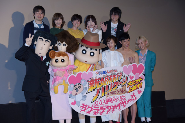 「映画クレヨンしんちゃん 新婚旅行ハリケーン ~失われたひろし~」の公開記念舞台挨拶にて、前列左から野原ひろし、みさえ、ひまわり、しんのすけ、木南晴夏、小島よしお、りゅうちぇる。後列左から橋本昌和監督、こおろぎさとみ、小林由美子、ならはしみき、森川智之。