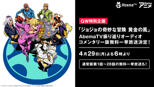 荒木飛呂彦原作によるTVアニメ「ジョジョの奇妙な冒険 黄金の風」のオーディオコメンタリー版が、4月29日18時よりAbemaTVにて一挙放送される。