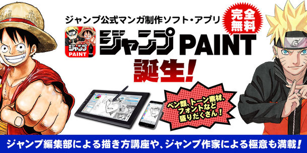 「ジャンプ PAINT」は、PCやタブレット、スマートフォンでマンガが描ける無料ペイントツール。ペン類、トーン素材、フォントなどすべて無料で使用できるほか、週刊少年ジャンプで実際に使用されているフォントの一部も用意されている。なおWebマンガ投稿、公開サイトの少年ジャンプルーキーとの連携機能も備えており、「ジャンプ PAINT」で描いた作品をスムーズに投稿することも可能だ。