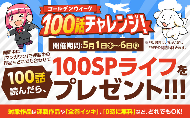 マンガワンでマンガを読みまくろう!100話読んだ人に100SPライフをプレゼント 2019年5月1日2019年5月1日 editor 「ゴールデンウィーク 100話チャレンジ!」の概要。小学館のアプリ・マンガワンでは、本日5月1日から6日までの期間、「ゴールデンウィーク 100話チャレンジ!」と題した施策を展開している。 同企画では期間中、マンガワンに掲載中の作品を100話読んだ人に「100SPライフ」をプレゼント。ライフを使ってさらにマンガを楽しむことができる。対象となる作品は連載作品や「全巻イッキ」「0時に無料」など。「PR」「おまけ」「FREE公開話」は対象外となる。 関連記事「チェンソーマン」×FREAK’S STORE チェンソーマン&ボムの描き下ろしアイテムも「Fate/strange Fake」椿&ライダーのビジュアル 古賀葵は笑っていてほしいと願う劇場版「呪術廻戦」入場者特典、第2弾は「死滅回游 前編」のビジュアルボード「人外教室の人間嫌い教師」人外女子役に沼倉愛美、福圓美里ら OPはオーイシマサヨシ「リゼロ」4期、2026年4月放送開始 初代剣聖のレイド役は杉田智和「佐々木とピーちゃん」シーズン2、2026年放送 新ビジュアル公開 Tweet