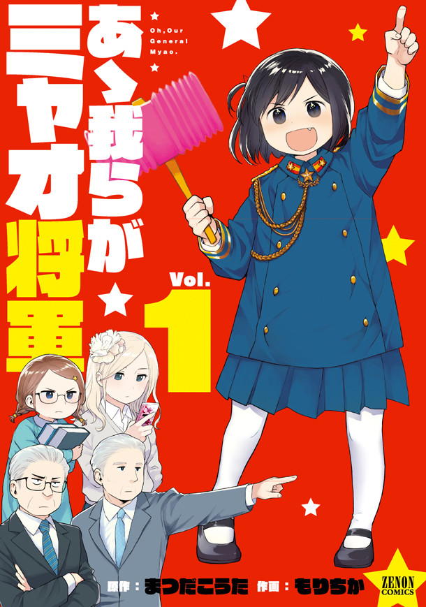 「あゝ我らがミャオ将軍」は、世襲制により9歳の若さで社会主義共和国コルドナの最高指導者となった少女・ミャオが主役のドタバタ政治劇。好奇心に負けてミサイルの発射スイッチを押してしまったり、かわいくないという理由で国旗のデザインを変更したり、気分屋のミャオが提案する無茶な意見にお付きの政治家たちが振り回される。気に食わない部下を有無を言わさず粛清しつつ、9歳のミャオが真剣に政治と向き合い国を良き方向へ導こうとがんばる姿を描く。同作は月刊コミックゼノン(徳間書店)のマンガサイト・WEBコミックぜにょんで連載中。