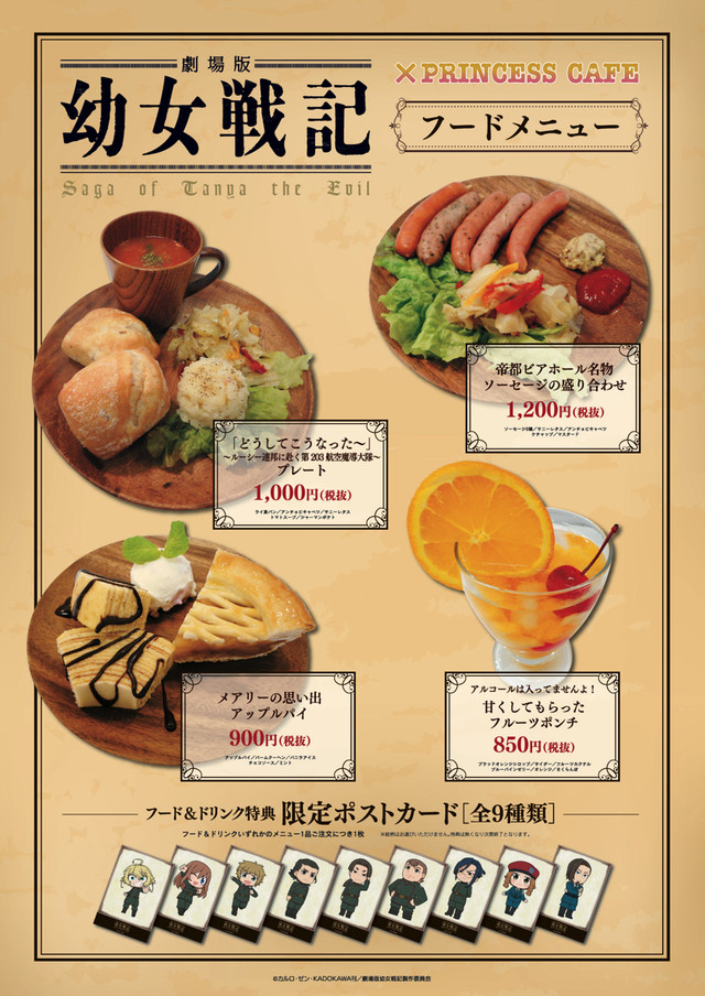 店内では作品をイメージした「『どうしてこうなった~』~ルーシー連邦に赴く第203航空魔導大隊~プレート」「帝都ビアホール名物ソーセージの盛り合わせ」といったフードメニューや、「ターニャの至福のひと時コーヒー」などターニャ、ヴィーシャ、メアリーらキャラクターの名を冠したドリンクを提供。またポストカード9種が、1品オーダーするごとにランダムで1枚進呈される。