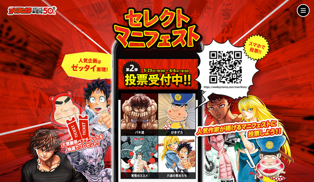 「セレクトマニフェスト」は、全13作品の作家がそれぞれ3つのマニフェストを掲げ、ファンが実現してほしいものに投票する企画。各作家のマニフェストのうち、どれか1つずつは実現し、7月15日に東京・秋葉原UDXギャラリーにて開催されるイベント「週刊少年チャンピオン創刊50周年大感謝祭」でお披露目される。