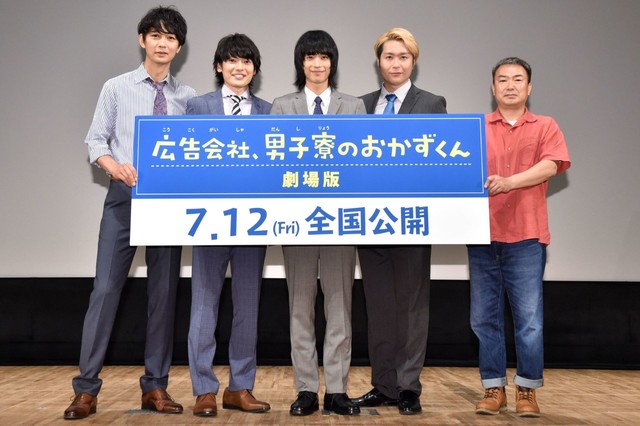 オトクニ原作による実写映画「広告会社、男子寮のおかずくん」完成披露舞台挨拶が本日6月2日に東京・よみうりホールにて開催され、キャストの黒羽麻璃央、崎山つばさ、小林且弥、大山真志、三原光尋監督が登壇した。