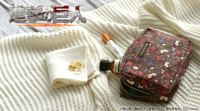 ラインナップされたのは、スクエアポーチ、スタンドミラー、チケットホルダー、iPhoneケース、スライドサンダル、バンダナの6種類。各アイテムには、作品内に登場する花々をベースに、エレンは地下室の鍵、ミカサはマフラー、アルミンは本、リヴァイはティーカップ、エルヴィンは馬、ハンジはゴーグルといったキャラクターのモチーフをちりばめた、ボタニカル柄のテキスタイルでデザインされた。