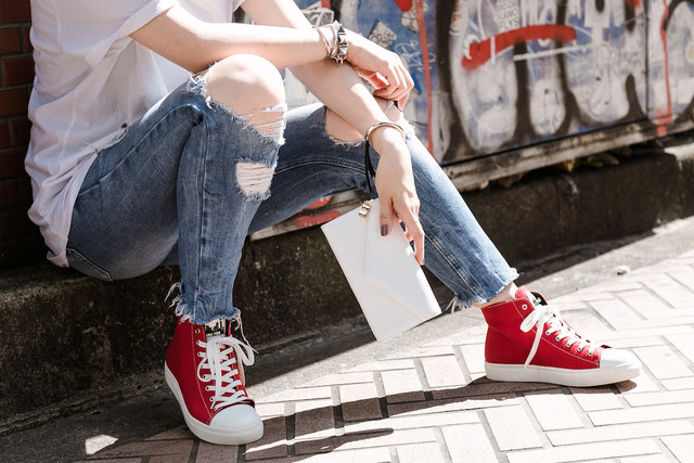 ハイカットスニーカーは赤色で、アッシュ・リンクスが作中で着用しているシューズをイメージ。フロント部分のタグにはニューヨークのビル群がデザインされ、かかと部分には「この街は俺の庭だぜ」という英文が刺繍されている。またインソールは灰色のベースに、“リンクス”を意味する山猫の姿がプリントされた。