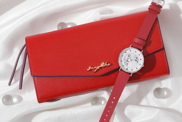 鮮やかなレッドを基調とした犬夜叉モデル。腕時計の文字盤は御神木をモチーフにしたデザインになっており、12時と6時の位置には犬夜叉とかごめをイメージしたカラーのスワロフスキーが施された。長財布のフラップ裏にも、御神木をイメージしたデザインが型押しされている。