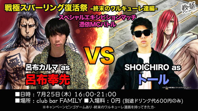 「『終末のワルキューレ』憑依MCバトル」では、呂布奉先役・呂布カルマvsトール役・SHOICHIRO、アダム役・じょうvsゼウス役・晋平太、佐々木小次郎役・韻マンvsポセイドン役・FRANKENという対戦カードを用意。マンガのキャラクターである歴史上の人物や神々に扮した6名による3本のバトルが展開される。このMCバトルは、イベント「戦極スパーリング復活祭」内企画として開催。入場は無料で、ドリンク代600円のみ必要となる。当日は「終末のワルキューレ」の単行本を持参した人を対象にしたビンゴゲームも行う。
