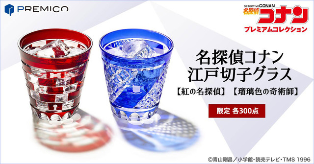 青山剛昌原作によるアニメ「名探偵コナン」と伝統工芸の江戸切子がコラボレート。コナンとキッドをイメージしたグラス2種が、PREMICOのオンラインショップにて各300点限定で販売されている。