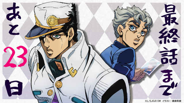2018年10月より放送中の本作は、イタリアを舞台に、ジョルノ・ジョバァーナとその仲間たちの生き様を描く物語。7月28日の放送でジョルノたちの戦いに幕が下りる。また最終話放送に向け、カウントダウンイラストを投稿する企画を実施。アニメの制作スタッフが描き下ろしたイラストが、公式Twitterアカウント(@jojo_anime)にて投稿される。1回目のイラストには、前シリーズ「ジョジョの奇妙な冒険 ダイヤモンドは砕けない」から登場した空条承太郎と広瀬康一が描かれた。TVアニメ「ジョジョの奇妙な冒険 黄金の風」は、TOKYO MX、毎日放送、BS11にて放送中。