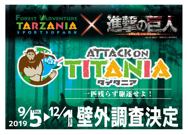 諫山創原作によるアニメ「進撃の巨人」と千葉・リソル生命の森内のアウトドアレジャー施設「フォレストアドベンチャー・ターザニア」がコラボレーション。期間限定イベント「ATTACK ON TITANIA」が9月5日から12月1日まで開催される。