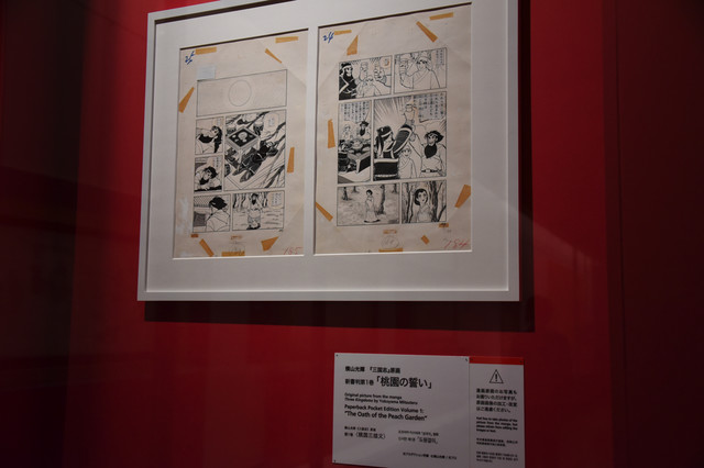 会場内は三国志文化の始まりを紐解く「プロローグ」から始まり、7つのパートに分かれた多彩な展示が並ぶ。「三国志」の原画は新書判第1巻「桃園の誓い」から劉備・関羽・張飛の3人が、盃を手に義兄弟の契りを交わす有名なシーンをはじめ、新書判第25巻「赤壁の前哨戦」、新書判第42巻「曹操の死」などの一部を各パートに配置。三国時代の終焉を展示で振り返る「エピローグ」のパートでは、新書判第59巻「秋風五丈原」から遺書をしたためる諸葛孔明の場面が選ばれた。