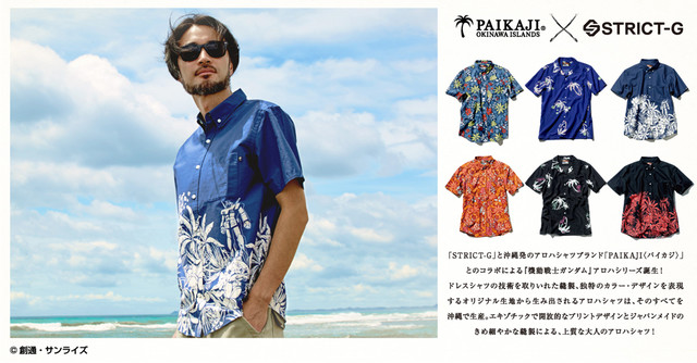 ドレスシャツの技術を取り入れた縫製と、独特のカラー・デザインを表現したオリジナルの生地で作られるPAIKAJIのアロハシャツ。「機動戦士ガンダム」とのコラボシャツでは、グランドパームツリー柄、ジャングリスト柄、ボタニカル・アース柄の3つのデザインからそれぞれ「ガンダム」「シャア専用ザクII」の2種が選べる。オープンシャツタイプのグランドパームツリー柄は、PAIKAJIのマークにもなっているパームツリーをビンテージ風に再現。また沖縄や亜熱帯に生息する植物の息吹をシンプルに表現したジャングリスト柄、地球上に存在する植物の共演をイメージしたボタニカル・アース柄は、台襟付きのボタンダウンとラウンド型の裾がスタイリッシュなシャツタイプに仕上げられた。それぞれのベースとなるエキゾチックなプリントの中に「ガンダム」の世界観が表現されている。