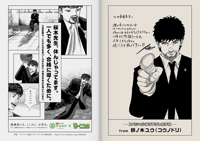 サントリーの緑茶・伊右衛門とモーニング(講談社)によるコラボレーション企画が始動。本誌で連載している、「ドラゴン桜2」の三田紀房、「宇宙兄弟」の小山宙哉、「GIANT KILLING」のツジトモ、「コウノドリ」の鈴ノ木ユウが、リレー形式で1週間ずつ休暇を取るというプロジェクトが始動する。